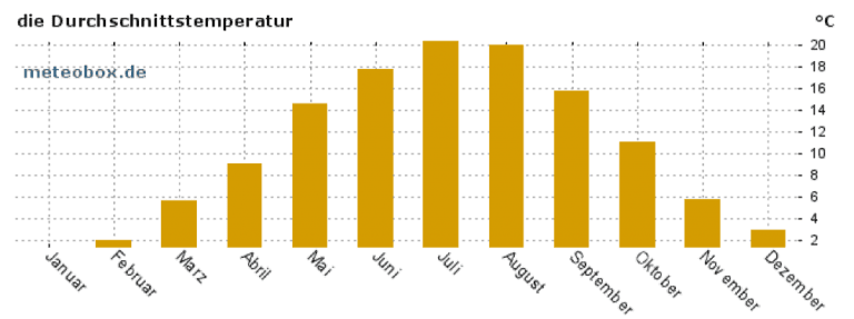Düsseldorf liegt in der Mitte des niederrheinischen Tieflandes und somit im Herzen der Metropolregion Rhein-Ruhr. Es handelt sich um das größte städtische Ballungsgebiet in Europa und ist das größte in Deutschland. Durch die Öffnung Richtung Nordsee herrscht hier ein ozeanisch-atlantisches Klima. Die westlichen Windströmungen tragen jedoch häufig feuchte Luftmassen heran. Die nachfolgende Grafik soll die durchschnittlichen Temperaturen etwas näherbringen.